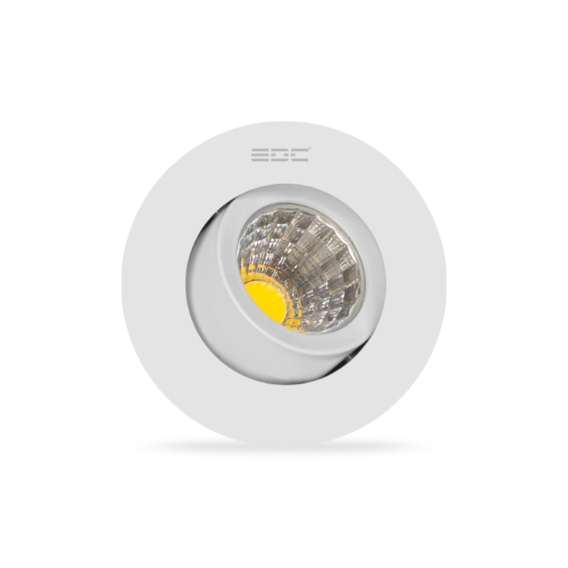 چراغ دکوراتیو توکار چشمی متحرک گرد EDC ۳ وات با طراحی قابلتنظیم و قطر برش ۴.۵، ۵ و ۵.۵ سانتیمتر، گزینهای ایدهآل برای نورپردازی متمرکز و حرفهای در فضاهای داخلی است.